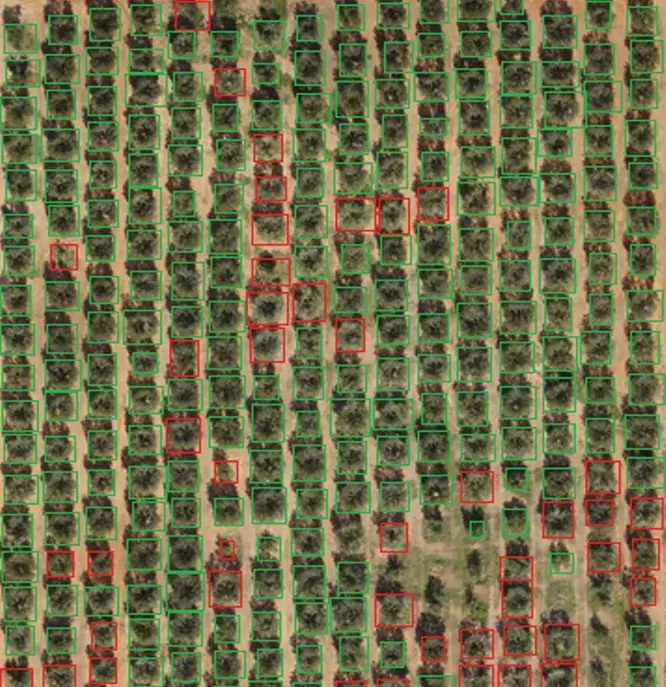 Οι εικόνες από τις τρεις κάμερες ενώνονται σε ορθομωσαϊκά, δηλαδή μεγάλες, ενιαίες απεικονίσεις του ελαιώνα. Στη συνέχεια, τα δεδομένα επεξεργάζονται από εκπαιδευμένο μοντέλο μηχανικής μάθησης που στηρίζεται στον αλγόριθμο YOLO.