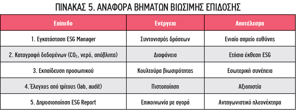 O Πίνακας 5 περιγράφει τα βασικά επίπεδα ωρίμανσης και λειτουργίας ενός συστήματος ESG σε μια επιχείρηση του ελαιοκομικού τομέα, από την αρχική οργάνωση μέχρι τη δημόσια λογοδοσία. Πρακτικά, δείχνει πώς μια επιχείρηση (π.χ. ελαιοτριβείο ή τυποποιητήριο) μπορεί να μεταβεί βήμα-βήμα από την εσωτερική οργάνωση έως την εξωτερική επικοινωνία και αναγνώριση της βιώσιμης επίδοσής της.