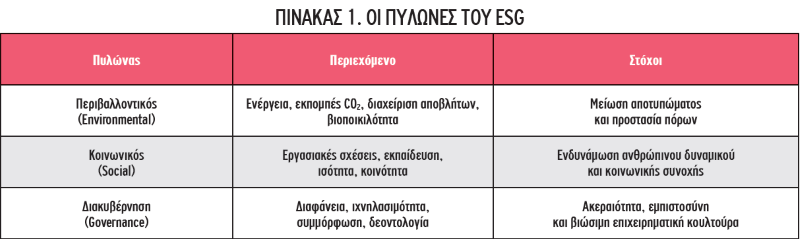 Το ESG είναι ένα ολοκληρωμένο σύστημα αξιολόγησης που στηρίζεται σε τρεις θεμελιώδεις πυλώνες (βλ. Πίνακα 1). Η φιλοσοφία ESG συνίσταται στην ενσωμάτωση της υπεύθυνης διαχείρισης σε κάθε στάδιο λειτουργίας της επιχείρησης: Από τη χρήση ενέργειας έως την αντιμετώπιση των εργαζομένων και τη διαφάνεια των διαδικασιών.