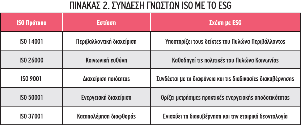 Το ESG δεν υποκαθιστά τα υπάρχοντα πρότυπα ISO, αλλά τα συνδέει σε ένα ενιαίο πλαίσιο αξιολόγησης (βλ. Πίνακα 2). Έτσι, το ESG μπορεί να θεωρηθεί ως ομπρέλα συστήματος, που ενοποιεί τα ISO πρότυπα σε μια ενιαία στρατηγική βιωσιμότητας.