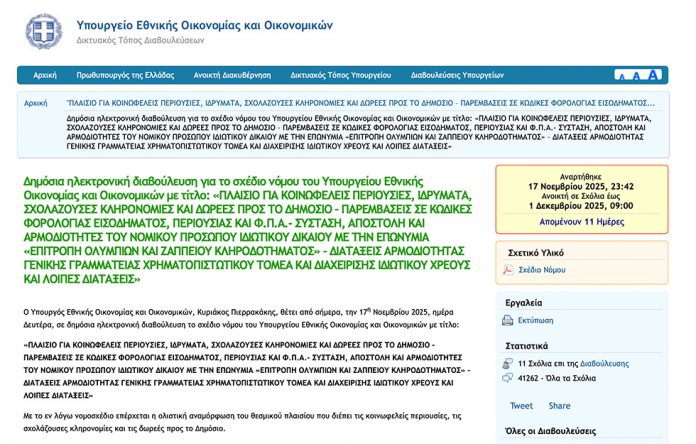 Σε διαβούλευση νομοσχέδιο για κληρονομιές και δωρεές και στα 4 δις το πλαφόν για τους Δήμους