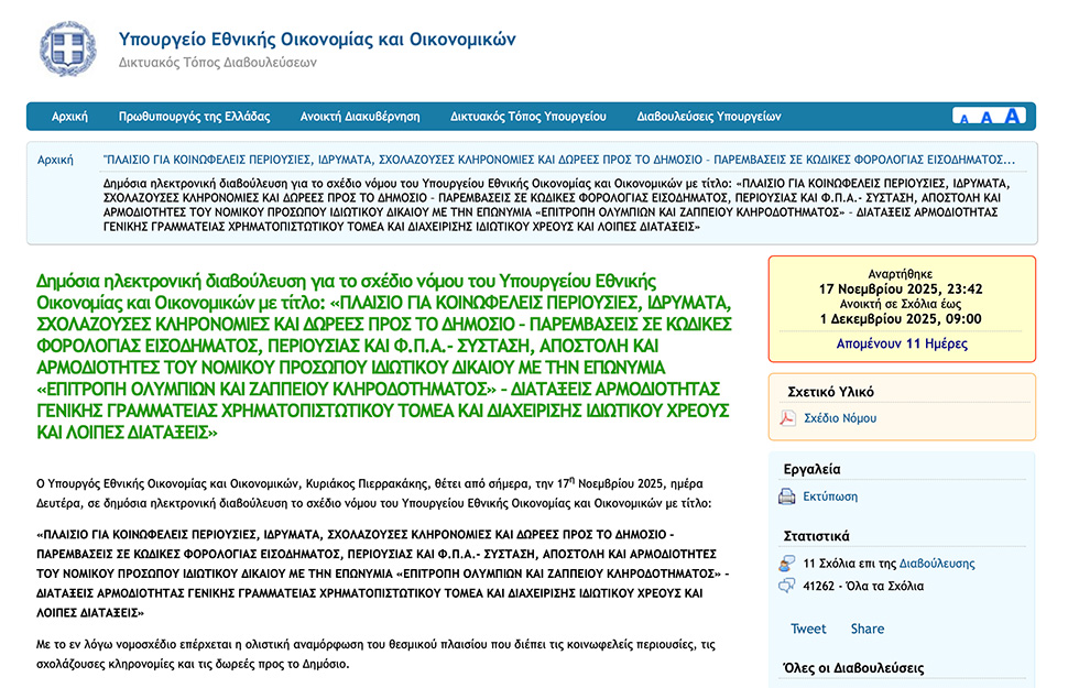 Σε δημόσια διαβούλευση βγήκε το Σχέδιο Νόμου «Πλαίσιο για κοινωφελείς περιουσίες, ιδρύματα, σχολάζουσες κληρονομίες και δωρεές προς το Δημόσιο», το οποίο εκτός από την εγκατάσταση ψηφιακού συστήματος δωρεών και κοινωφελών περιουσιών, περιλαμβάνει σημαντικές παρεμβάσεις που επηρεάζουν άμεσα τους δήμους και τις δομές της Τοπικής Αυτοδιοίκησης.